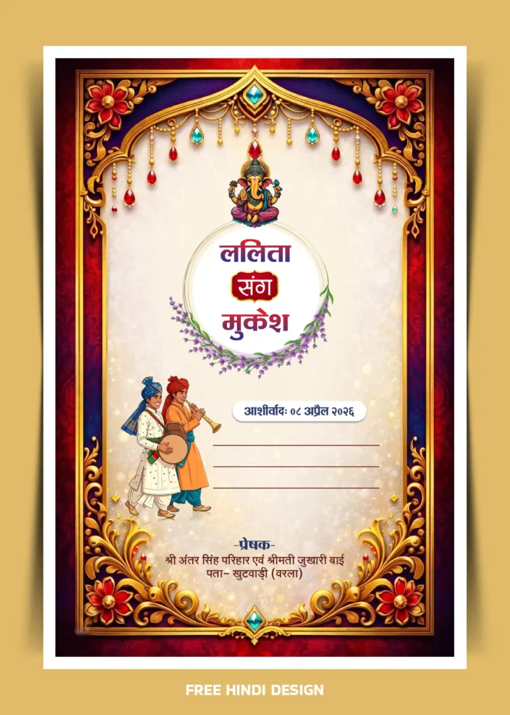 Download a beautifully crafted Hindi wedding card template designed to give your invitation a premium and traditional touch. This elegant 5×7.5 inch शादी कार्ड template is perfect for creating stunning invitations that reflect Indian culture and modern design aesthetics. Whether you are planning a grand celebration or an intimate ceremony, this hindi wedding card design helps you create a memorable first impression.